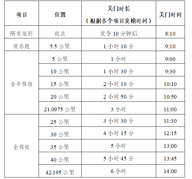 为保证参赛选手比赛安全、顺利,限时对社会交通进行滚动封闭。比赛路线各段专设了赛时关门时间,关门时间后,相应公里点的计时毯停止工作,相应路段将恢复社会交通。在规定关门时间内,未跑完对应距离的参赛选手须立即停止比赛,退出赛道,以免发生危险。退出比赛的选手可搭乘组委会提供的收容车或自行选乘公共交通抵达相应项目的存取衣物处。