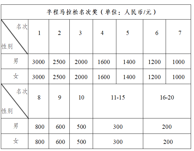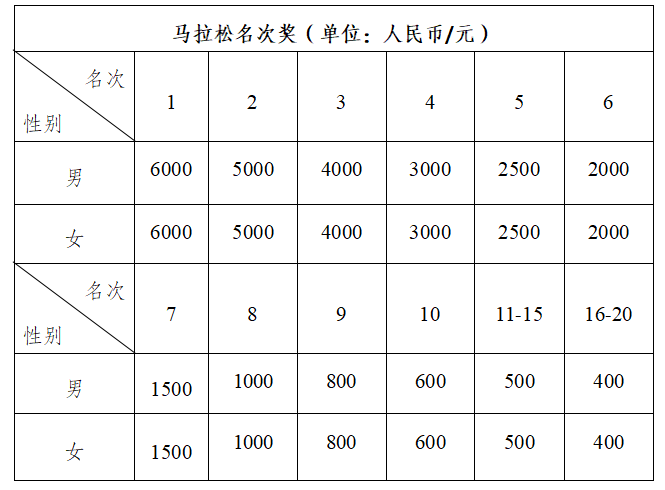 参赛者按枪声成绩分别录取男、女前3名,4-20名按照净计时分别录取,奖金明细见下表: