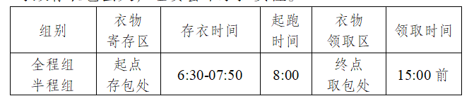 比赛当天起点存衣服务将于鸣枪前10分钟截止,请选手做好时间安排。全、半程马拉松选手可在比赛当日15:00前到终点指定区域领取个人存放物品。如超过领取时间没有领取的,可于赛后一周内到赛事组委会领取(如需邮寄,产生的费用由运动员本人承担);一周内不领取,组委会将按无人领取处理;如未按照组委会指定时间、地点和方式存衣,导致存衣包丢失,组委会不承担责任。