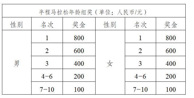 参赛者按净计时成绩分别录取男、女前10名,奖金明细见下表: