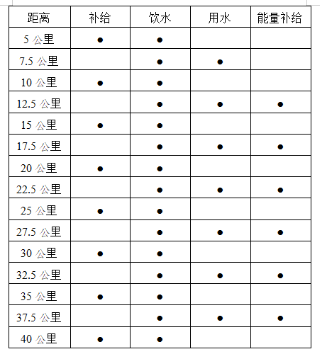 1.饮料、饮水、用水站:自起点开始大约每5公里的间隔距离设置一个饮料/饮水站,两个饮料/饮水站中间设置饮水/用水站。