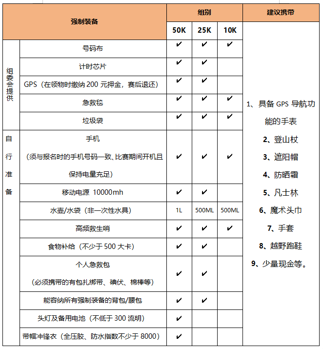 1、所有强制装备须可正常使用,且全程携带。为保障选手顺利安全完赛,在赛前领物时将严格对应组别进行强制装备检查,并在起终点和部分检查点进行强制装备抽查,不符合强制装备要求的选手将被取消参赛资格。组委会有权在赛前根据天气情况,调整强制装备检查要求。