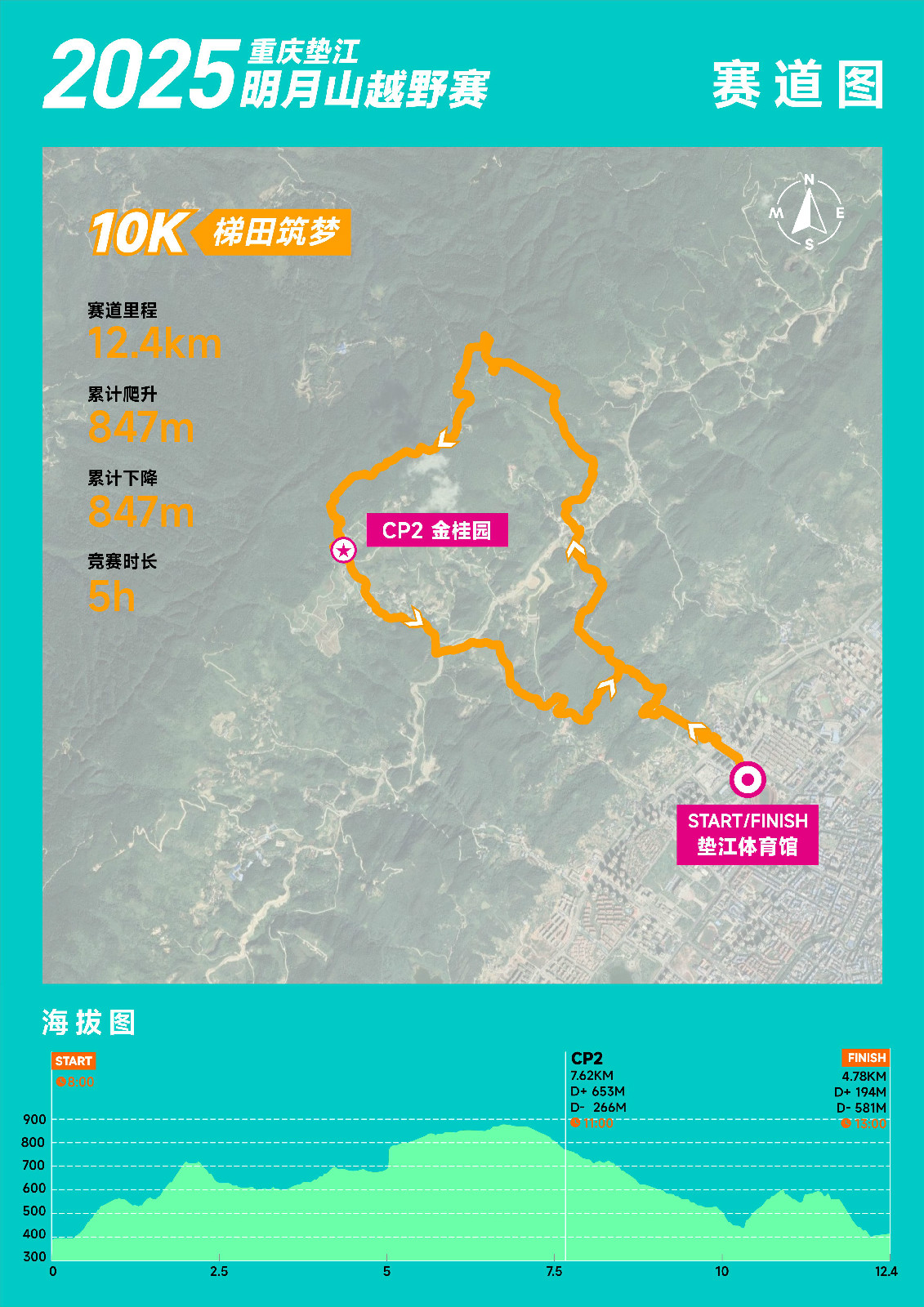 起点:垫江体育馆—天宝寨—红旗山—西山村—垫竹古道—羊房—童雪桃源—CP2金桂园—坛子口—九沐溪谷—天宝寨——终点:垫江体育馆