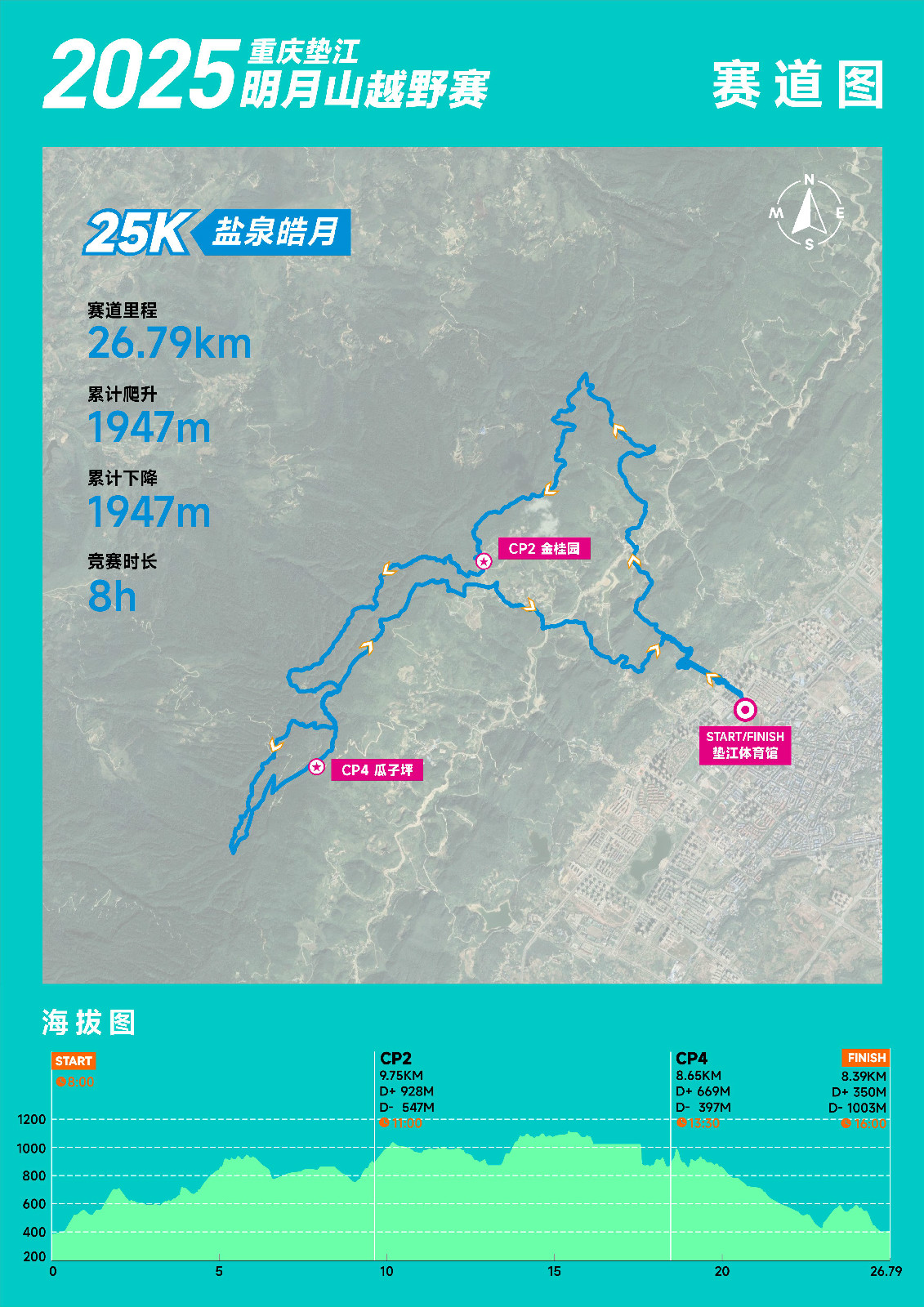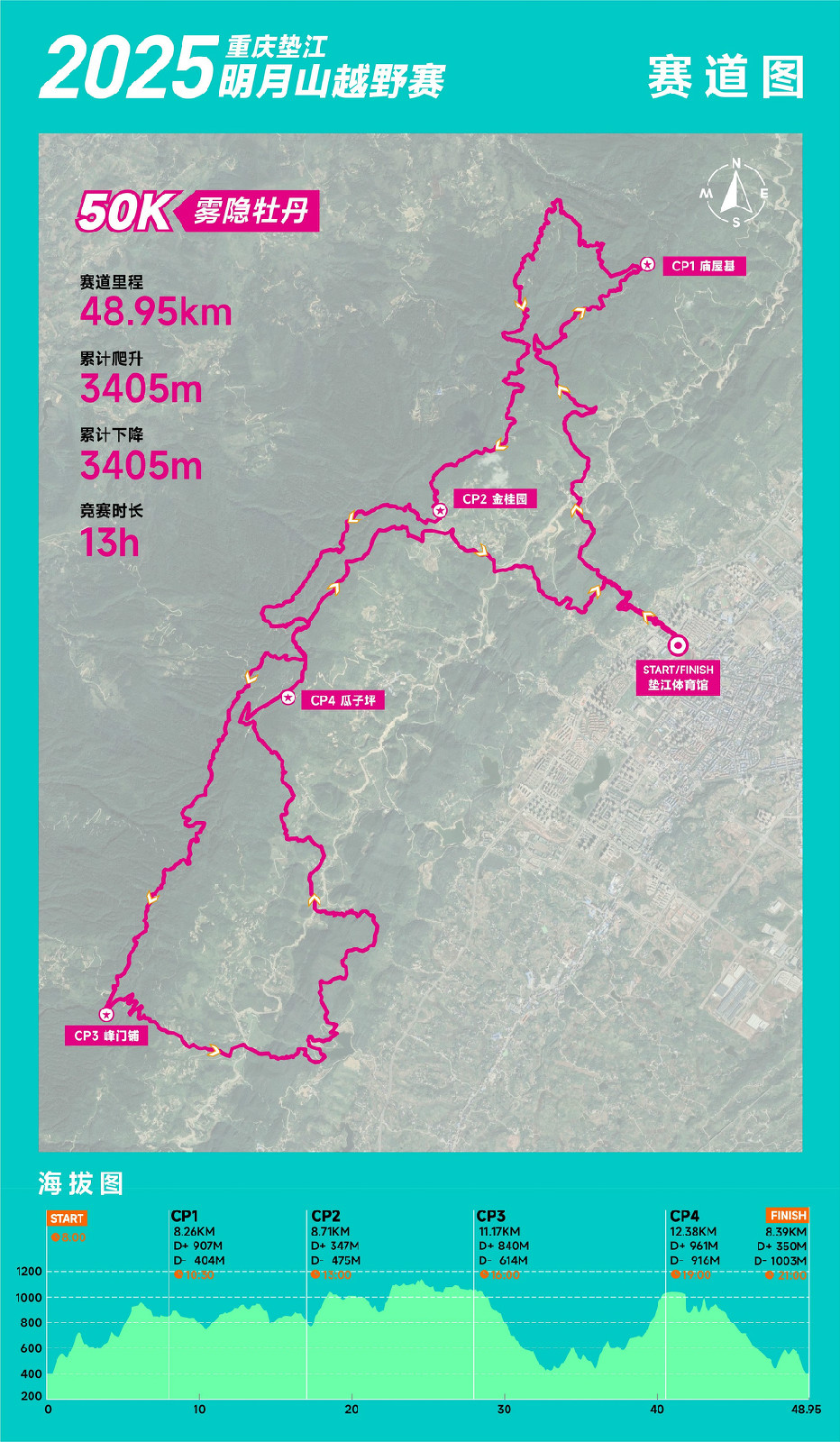 起点:垫江体育馆—天宝寨—红旗山—西山村—垫竹古道—羊房—童雪桃源—CP2金桂园—山脊林道—护林站—五一林—尖顶峰—飞播烈士纪念碑—CP4瓜子坪—金桂园—坛子口—九沐溪谷—天宝寨—终点:垫江体育馆