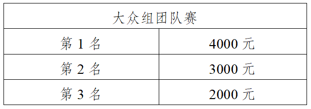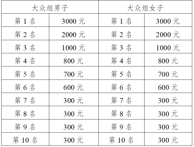 大众组成绩按净计时录取男、女前十名,为男、女前三名安排颁奖仪式。奖金见下表(单位:人民币/元)。