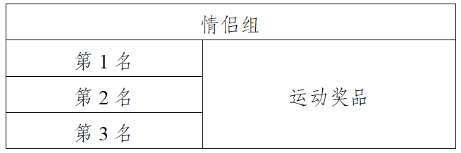情侣组按净计时录取前三名。情侣组最终成绩取两人净成绩之和。如团队成绩相同,则以该组第一个到达终点选手的净计时成绩进行比较,净计时成绩优者名次列前。如再相同,名次并列(无下一名次)。现场举行颁奖仪式,奖品奖励见下表。