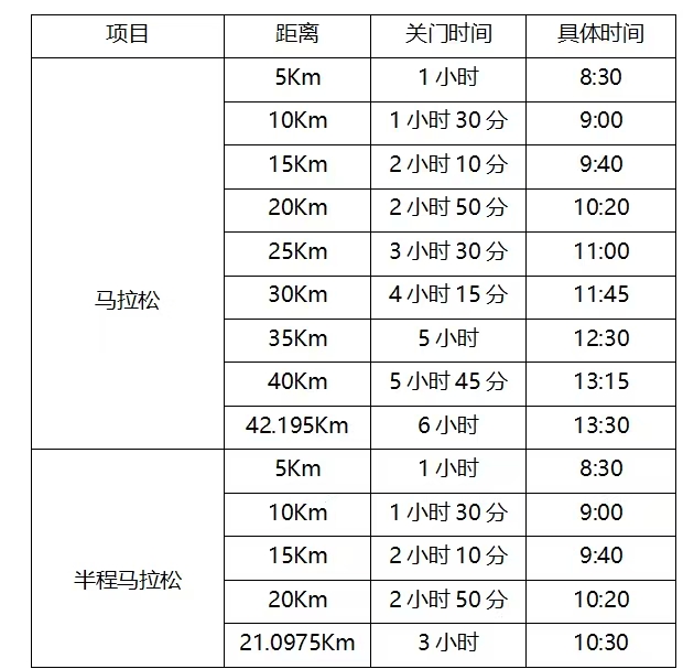 为了保证参赛运动员比赛安全、顺利,比赛期间比赛路线各段设关门时间,限时对交通封闭。起跑至关门时间到后,各路段恢复社会交通。参赛运动员在规定的关门时间内未跑完对应距离的参赛运动员须立即停止比赛,退出赛道,以免发生危险。退出比赛运动员可乘坐组委会提供的收容车到相应项目的终点。否则由此引发的事故将由参赛运动员自行承担相应法律责任和赔偿责任。