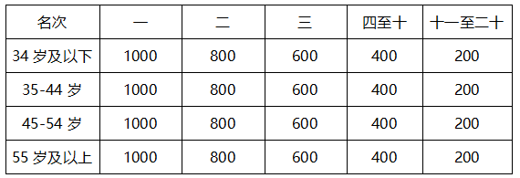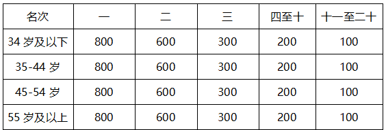 2、年龄分组奖:根据净计时成绩录取各年龄组男/女前二十名,如果对应名次运动员发现违规,取消该运动员名次,后面名次不递增。奖金见下表(单位:人民币/元)