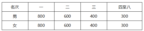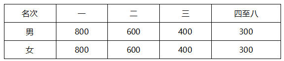3、垫江县市民奖:仅限垫江户籍参赛选手(身份证512322、500231开头),根据净计时成绩分别录取男/女前八名,如果对应名次运动员发现违规,取消该运动员名次,后面名次不递补;奖金见下表(单位:人民币/元)