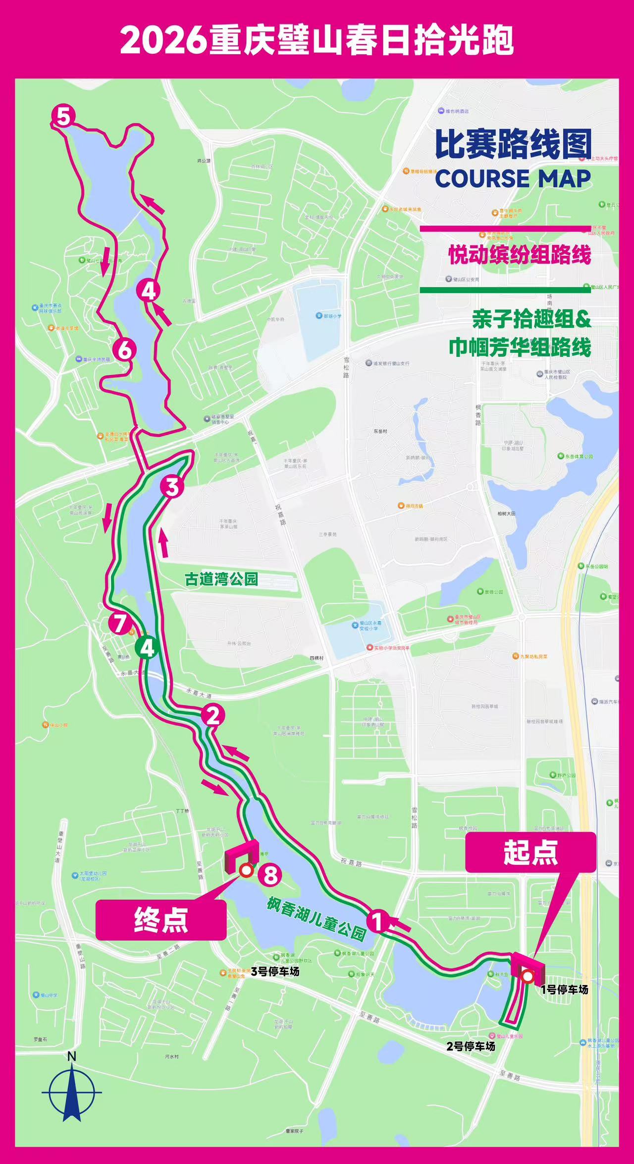 (一)悦动缤纷组(8公里)路线描述:枫香湖儿童公园1号停车场(起点)—枫香坝—耕读大街—亚洲中学旧址—茅来山居古道湾北门—蓝菲国际酒庄—璧山七彩梯田花海—茶驿公园—雪庵亭—枫香湖儿童舞台(终点)