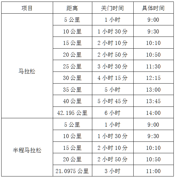 为了保证参赛运动员比赛安全、顺利,比赛期间比赛路线各段设关门时间,限时对交通封闭。起跑至关门时间到后,各路段恢复社会交通。参赛运动员在规定的关门时间内未跑完对应距离的参赛运动员须立即停止比赛,退出赛道,以免发生危险。退出比赛运动员可乘坐组委会提供的援助车到相应项目的终点。否则由此引发的事故将由参赛运动员自行承担相应法律责任和赔偿责任。